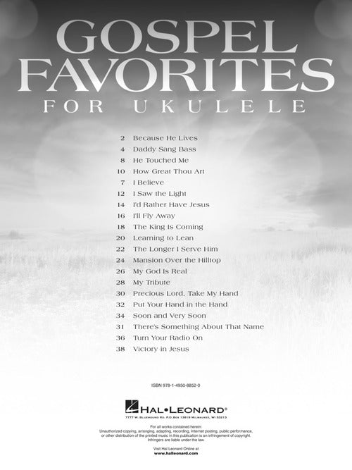 20 classics to strum and sing on the uke in standard G-C-E-A tuning with melody, lyrics and chord diagrams. Songs: Because He Lives · Daddy Sang Bass · How Great Thou Art · I'll Fly Away · The King Is Coming · Mansion over the Hilltop · My Tribute · Precious Lord, Take My Hand (Take My Hand, Precious Lord) · Soon and Very Soon · There's Something About That Name · Victory in Jesus · and more.