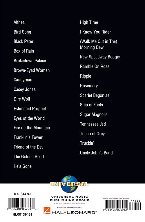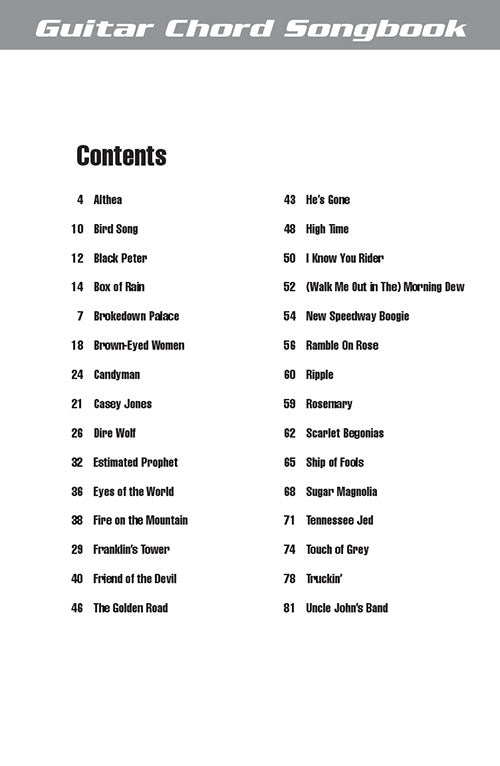 The perfect little songbook to pack for your next road trip! Just the basics you need to play 30 Grateful Dead favorites: lyrics and chords! Songs include: Althea · Casey Jones · Dire Wolf · Franklin's Tower · Friend of the Devil · High Time · Ramble on Rose · Ripple · Rosemary · Sugar Magnolia · Tennessee Jed · Touch of Grey · Truckin' · Uncle John's Band · and more!