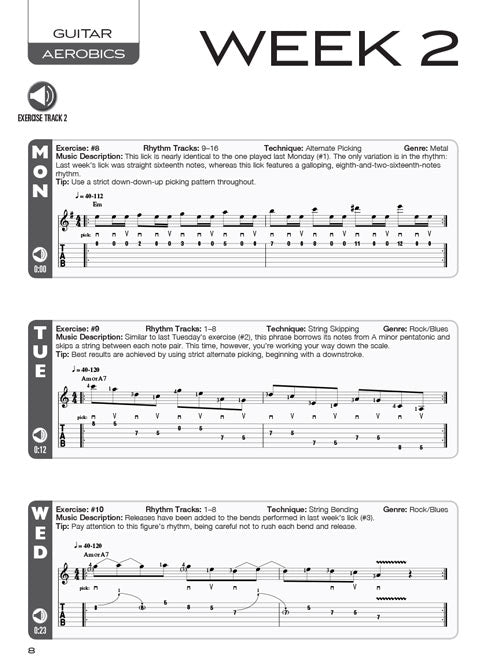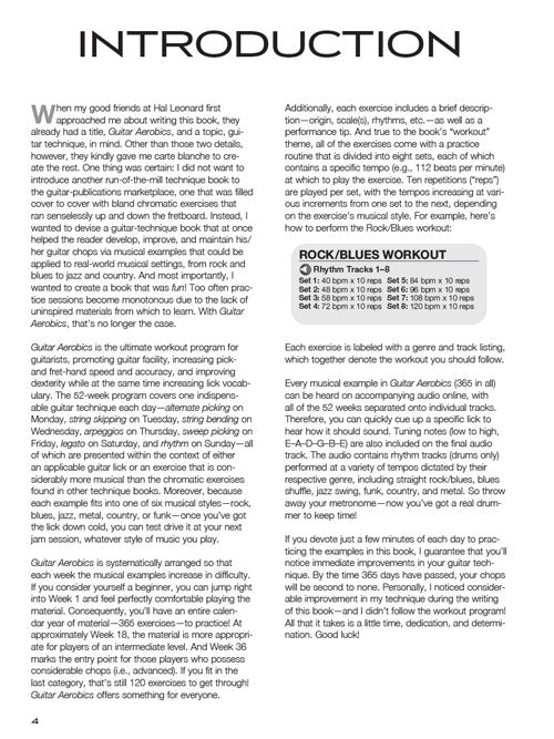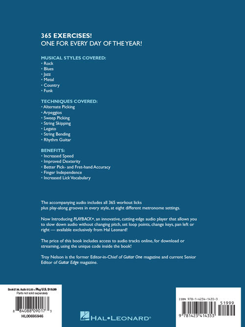 From the former editor of Guitar One magazine, here is a daily dose of vitamins to keep your chops fine tuned! Musical styles include rock, blues, jazz, metal, country, and funk. Techniques taught include alternate picking, arpeggios, sweep picking, string skipping, legato, string bending, and rhythm guitar. These exercises will increase speed, and improve dexterity and pick- and fret-hand accuracy. The accompanying online audio includes all 365 workout licks plus play-along grooves in every style at eight different metronome settings.