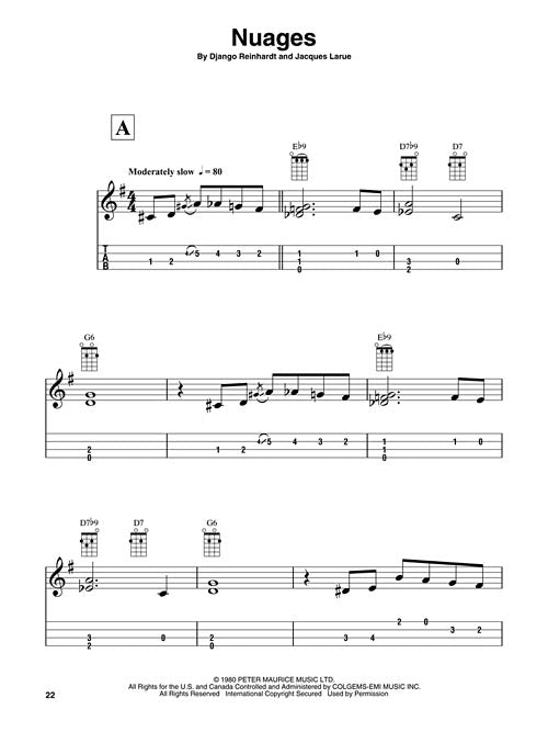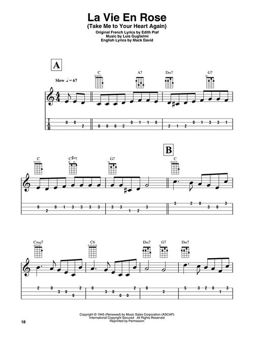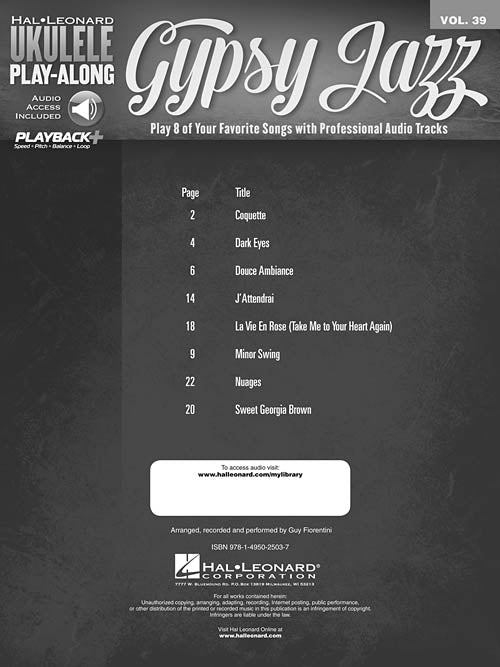 The Ukulele Play-Along series will help you play your favorite songs quickly and easily, with incredible backing tracks to help you sound like a bona fide pro! Just follow the written music, stream or download the online audio to hear how the ukulele should sound, and then play along with the separate backing tracks. The melody and lyrics are included in the book in case you want to sing, or to simply help you follow along. The audio is enhanced so Mac & PC users can adjust the recording to any tempo without changing the pitch! This volume includes 8 Gyspy jazz tunes: Coquette · Dark Eyes · Douce Ambiance · J'Attendrai · La Vie En Rose (Take Me to Your Heart Again) · Minor Swing · Nuages · Sweet Georgia Brown.