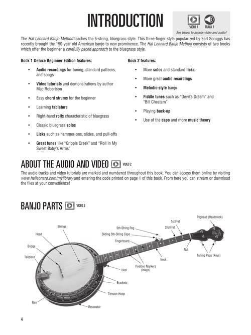 The Hal Leonard Banjo Method Deluxe Beginner Edition is the updated and revised version of the original classic method, now including both audio and video. This comprehensive and easy-to-use beginner's guide is designed for anyone just learning to play bluegrass-style 5-string banjo. It includes loads of techniques, tips, and fun songs to learn and play. Includes 97 tracks of full-band demos covering every music example in the book, plus nearly an hour of invaluable video tutorials by author Mac Robertson! Includes: The basics; Tuning; Reading tablature; Playing chords; Playing notes; Learning rhythm; Right-hand rolls; Hammer-ons and pull-offs; Pinches and slides; Many classic bluegrass songs; much more! The book includes access to audio tracks and video tutorials for download and streaming.