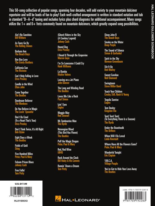This 5-song collection of popular songs, spanning four decades, will add variety to your mountain dulcimer repertoire and will be loads of fun to play! Each well-crafted arrangement is written in standard notation and tab in standard D-A-d tuning and includes lyrics plus chord diagrams for additional accompaniment. Many songs utilize the 1+ and 6+ frets commonly found on mountain dulcimers, which greatly expand song possibilities. Songs include: Ain't No Sunshine · Can't Help Falling in Love · Fields of Gold · Folsom Prison Blues · Free Fallin' · I Heard It Through the Grapevine · I'm So Lonesome I Could Cry · Leaving on a Jet Plane · The Long and Winding Road · Lyin' Eyes · Maggie May · Mr. Tambourine Man · Norwegian Wood (This Bird Has Flown) · Puff the Magic Dragon · Red, Red Wine · Runnin' down a Dream · Smoke on the Water · The Sound of Silence · Sweet Caroline · Turn! Turn! Turn! (To Everything There Is a Season) · Under the Boardwalk · Wonderful Tonight · Y.M.C.A. · You've Got to Hide Your Love Away · and more!