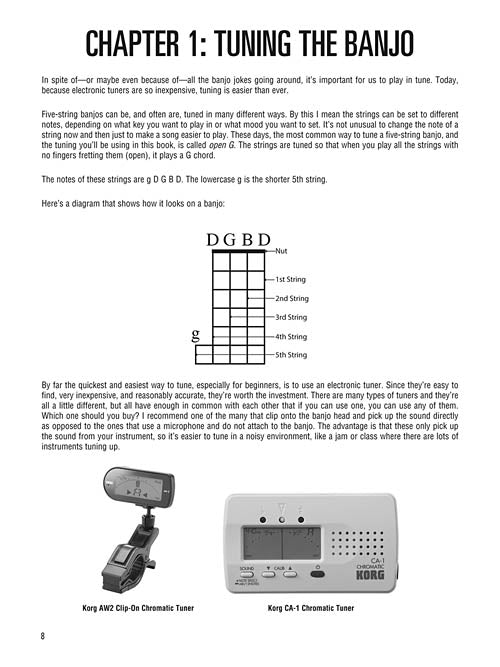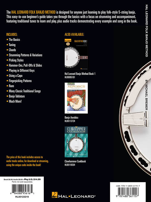 Hal Leonard Folk Banjo Method for 5-String Banjo Softcover Audio Online The Hal Leonard Folk Banjo Method is designed for anyone just learning to play folk-style 5-string banjo. This easy-to-use beginner's guide takes you through the basics with a focus on strumming and accompaniment, featuring traditional tunes to learn and play, plus audio tracks demonstrating every example and song in the book. The price of this book includes access to audio tracks online, for download or streaming, using the unique code inside the book! Covers: the basics; tuning; chords; strumming patterns & variations; picking styles; hammer-ons, pull-offs and slides; playing in different keys; and more. Online audio is accessed at halleonard.com/mylibrary (http://www.halleonard.com/mylibrary) Inventory # : 00123219 UPC: 884088956165 ISBN: 1480361151 Width: 9" Length: 12" Height: 0.174" Product Weight: 0.5 lbs. Number of Pages: 64