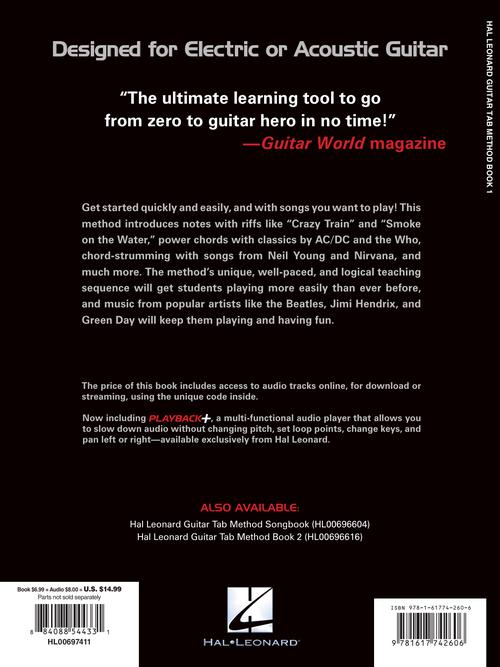 The ultimate learning tool to go from zero to guitar hero in no time! -Guitar World magazine Designed for electric or acoustic guitar. Get started quickly and easily - with songs you want to play! This method introduces notes with riffs like Crazy Train and Smoke on the Water, power chords with classics by AC/DC and the Who, chord-strumming with songs from Neil Young and Nirvana, and much more. The method's unique, well-paced, and logical teaching sequence will get students playing more easily than ever before, and music from popular artists like the Beatles, Jimi Hendrix, and Led Zeppelin will keep them playing and having fun. Book 1 includes: parts of the guitar, easy-to-follow guitar tablature, notes & riffs starting on the low E string, tempo & time signatures, understanding notes and rests, palm muting, vibrato, power chords, open chords, strumming, slides and slurs, hammer-ons and pull-offs, many music styles, nearly 100 riffs and songs, online audio access to demos of every example, and more!