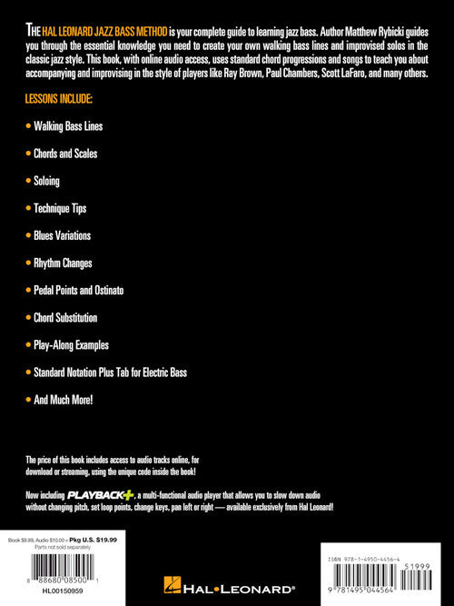 The Hal Leonard Jazz Bass Method is your complete guide to learning jazz bass. Author Matthew Rybicki guides you through the essential knowledge you need to create your own walking bass lines and improvised solos in the classic jazz style. This book, with online audio access, uses standard chord progressions and songs to teach you about accompanying and improvising in the style of players like Ray Brown, Paul Chambers, Scott LaFaro, and many others. Lessons include: walking basics; chords and scales; blues; rhythm changes; string raking; soloing; technique; chord substitution; pedal points and ostinato; standard notation plus tab for electric bass; and much more! Audio is accessed online using the unique code inside the book and can be streamed or downloaded. The audio files include PLAYBACK+, a multi-functional audio player that allows you to slow down audio without changing pitch, set loop points, change keys, and pan left or right.