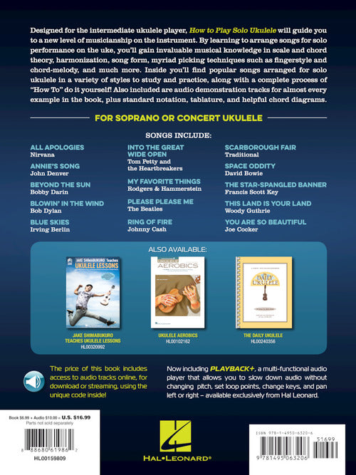 Designed for the intermediate ukulele player, this book will guide you to a new level of musicianship on the instrument. By learning to arrange songs for solo performance on the uke, you'll gain invaluable musical knowledge in scale and chord theory, harmonization, song form, myriad picking techniques such as fingerstyle and chord-melody, and much more. Inside you'll find popular songs arranged for solo ukulele in a variety of styles to study and practice, along with a complete process of How to do it yourself! Also incuded are audio demonstration tracks for almost every example in the book, plus standard notation, tablature and helpful chord diagrams. Songs include: All Apologies · Annie's Song · Beyond the Sea · Blowin' in the Wind · Blue Skies · Into the Great Wide Open · My Favorite Things · Please Please Me · Ring of Fire · Scarborough Fair · Space Oddity · The Star-Spangled Banner · This Land Is Your Land · You Are So Beautiful.