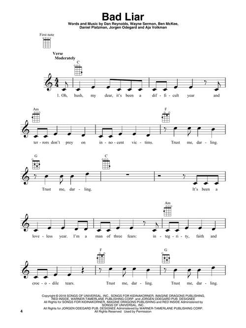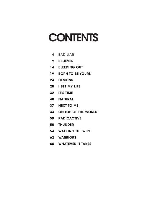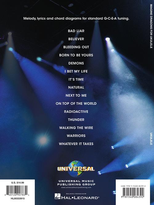 Now you can play the driving hits of Imagine Dragons on the uke! This collection features 15 songs arranged with melody, lyrics and chord diagrams for standard G-C-E-A tuning. Songs include: Bad Liar · Believer · Bleeding Out · Born to Be Yours · Demons · I Bet My Life · It's Time · Natural · Next to Me · On Top of the World · Radioactive · Thunder · Walking the Wire · Warriors · Whatever It Takes.