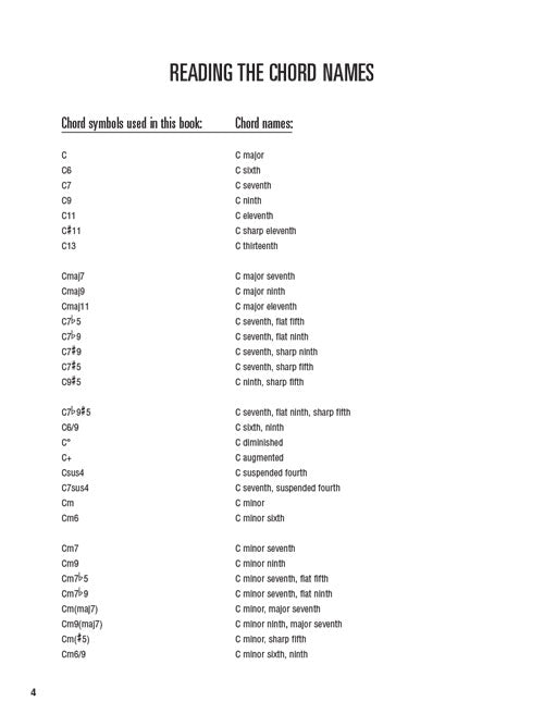 A complete guide diagramming over 1,000 guitar chords in their most common voicings. The book is arranged chromatically and each chord is illustrated in three ways for three levels of difficulty: the easiest form of the chords for the beginner and the more difficult versions for the intermediate and advanced players. Note names of each string are indicated on each chord diagram to let the player know what notes are being played in the chord.