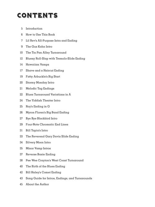 Great songs have four things in common: a strong intro, a powerful ending, a melodic hook or catchy riff, and memorable lyrics. If you'd like to learn how you can spice up your repertoire, let Lil' Rev show you how a simple intro or ending can really lift a tune up. In this book and video pack, you'll explore early jazz, blues, rock, folk and old time traditions. Open to anyone who already knows some basic chords and is willing to venture up the neck a little! Includes nearly an hour of video lessons available for download or streaming online, featuring performances by Lil' Rev.