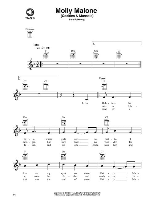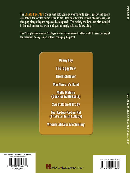 The Ukulele Play-Along series will help you play your favorite songs quickly and easily, with incredible backing tracks to help you sound like a bona fide pro! Just follow the written music, listen to the audio to hear how the ukulele should sound, and then play along with the separate backing tracks. The melody and lyrics are included in the book in case you want to sing, or to simply help you follow along. The audio is accessed online using the unique code inside each book and can be streamed or downloaded. The audio files include PLAYBACK+, a multi-functional audio player that allows you to slow down audio without changing pitch, set loop points, change keys, and pan left or right. Each Ukulele Play-Along pack features eight quintessential songs. Songs include: Danny Boy · The Foggy Dew · The Irish Rover · MacNamara's Band · Molly Malone (Cockles & Mussels) · Sweet Rosie O'Grady · Too-Ra-Loo-Ra-Loo-Ral (That's an Irish Lullaby) · When Irish Eyes Are Smiling.