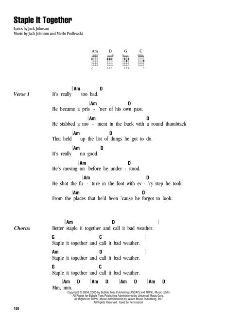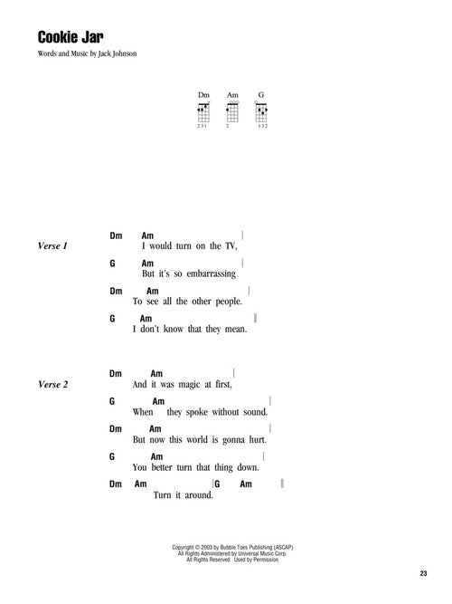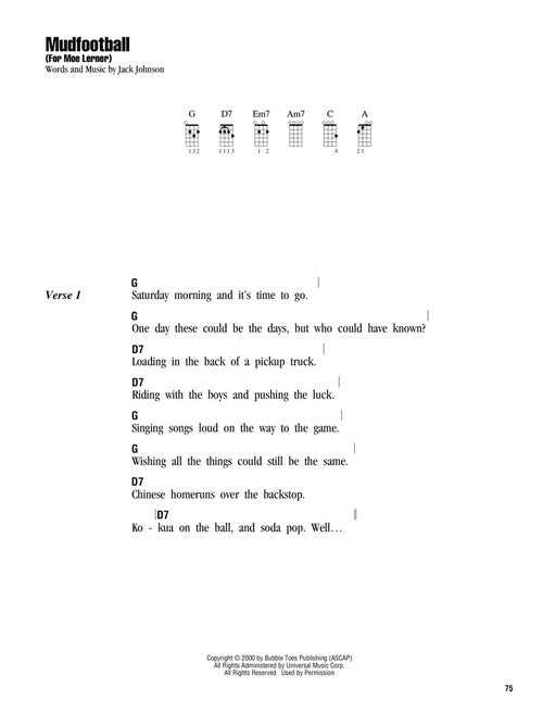 Strum along with 41 Jack Johnson songs using this top-notch collection of chords and lyrics just for the uke! Includes: Better Together · Bubble Toes · Cocoon · Do You Remember · Flake · Fortunate Fool · Good People · Holes to Heaven · Taylor · Tomorrow Morning · and more.