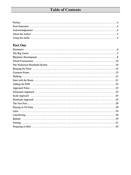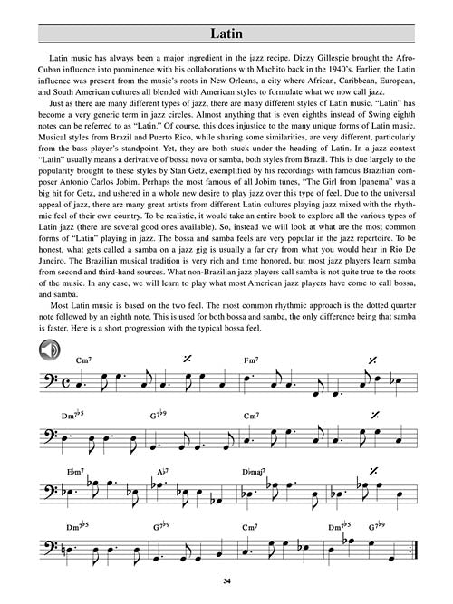 This book/audio pack features over 50 examples covering walking bass, the two feel, 3/4 time, Latin, and ballads. It covers soloing, performance protocol, and includes seven complete tunes. Demo tracks are accessed online via download or streaming and include playback options to make learning easier than ever.