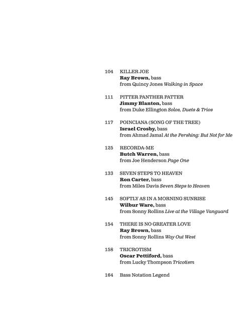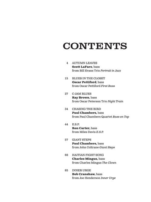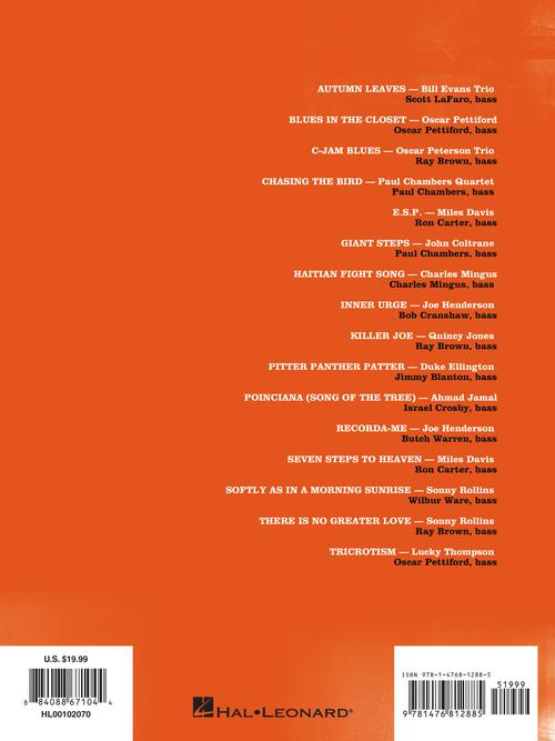 16 great performances transcribed note-for-note with tab for acoustic and electric bass. Includes: Autumn Leaves (Scott LaFaro) · C-Jam Blues (Ray Brown) · Chasing the Bird (Paul Chambers) · Giant Steps (Paul Chambers) · Inner Urge (Bob Cranshaw) · Killer Joe (Ray Brown) · Poinciana (Song of the Tree) (Chuck Israels) · Seven Steps to Heaven (Ron Carter) · Softly as in a Morning Sunrise (Wilbur Ware) · There Is No Greater Love (Ray Brown) · and more.