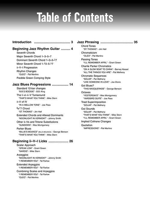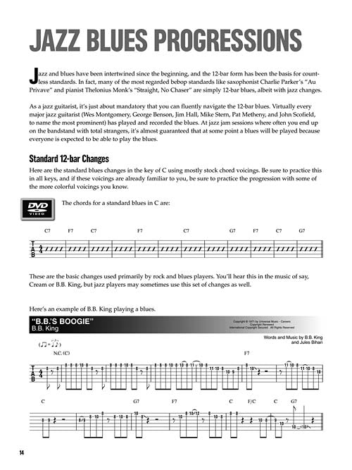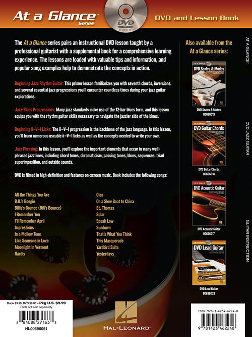 The At a Glance series pairs an instructional DVD lesson taught by a professional guitarist with a supplemental book for a comprehensive learning experience. Each book/DVD features several lessons pertaining to one topic, and the hi-def DVD features on-screen music. The lessons are loaded with valuable tips and information, and popular song examples help to demonstrate the concepts in action. Jazz Guitar - At a Glance features four lessons: Beginning Jazz Rhythm Guitar, Jazz-Blues Progressions, Beginning ii-V-I licks, and Jazz Phrasing. Includes 20 hit songs: B.B.'s Boogie · Billie's Bounce (Bill's Bounce) · I'll Remember April · Moonlight in Vermont · St. Thomas · Speak Low · This Masquerade · Yardbird Suite · and more.