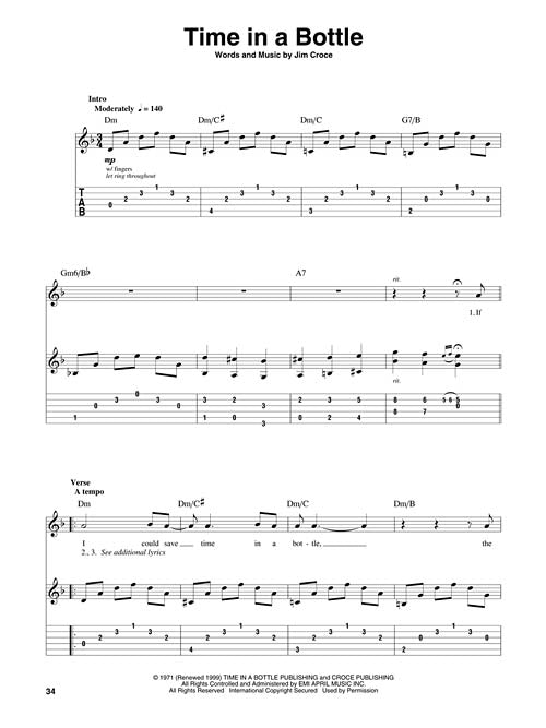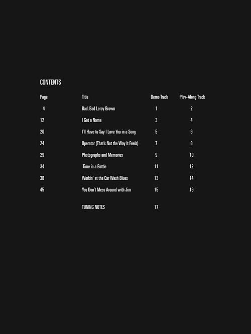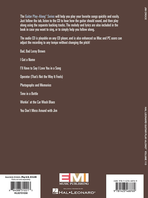 The Guitar Play-Along Series will help you play your favorite songs quickly and easily! Just follow the tab, listen to the audio to hear how the guitar should sound, then play along using the separate backing tracks. The melody and lyrics are included in the book.The audio is accessed online using the unique code inside each book and can be streamed or downloaded. The audio files include PLAYBACK+, a multi-functional audio player that allows you to slow down audio without changing pitch, set loop points, change keys, and pan left or right. Includes: Bad, Bad Leroy Brown · I Got a Name · I'll Have to Say I Love You in a Song · Operator (That's Not the Way It Feels) · Photographs and Memories · Time in a Bottle · Workin' at the Car Wash Blues · You Don't Mess Around with Jim.