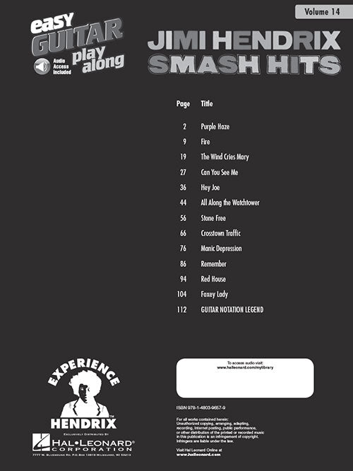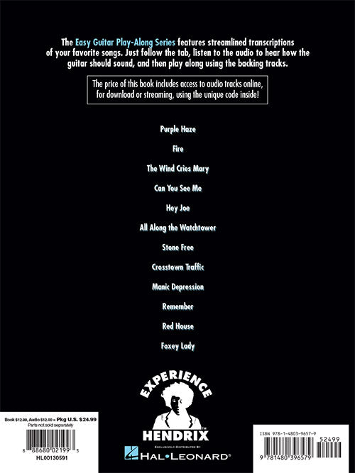 The Easy Guitar Play-Along® series features streamlined transcriptions of your favorite songs. Just follow the tab, listen to the audio demo to hear how the guitar should sound, and then play along using the backing tracks. The price of this book includes access to audio tracks online, for download or streaming, using the unique code provided. This volume features 12 Hendrix classics: All Along the Watchtower · Crosstown Traffic · Foxey Lady · Hey Joe · Manic Depression · Purple Haze · Red House · The Wind Cries Mary · and more.