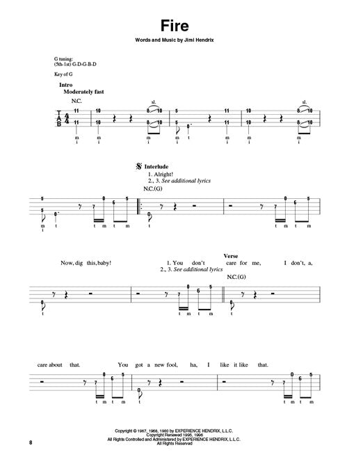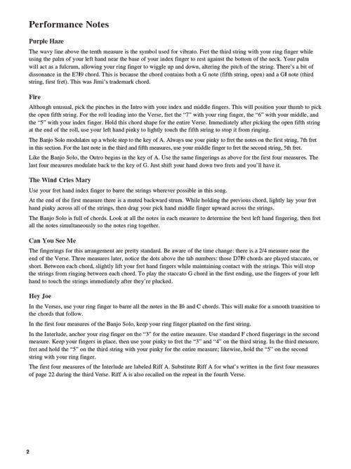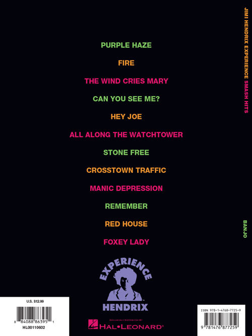 Take your banjo places it's only dreamed of with this amazing collection of 12 Hendrix gems arranged specifically for banjo tab. Includes: All Along the Watchtower · Can You See Me · Crosstown Traffic · Fire · Foxey Lady · Hey Joe · Manic Depression · Purple Haze · Red House · Remember · Stone Free · The Wind Cries Mary.