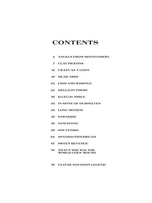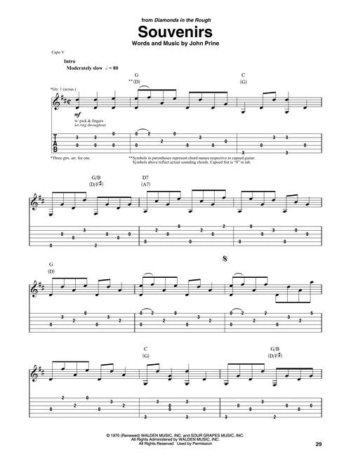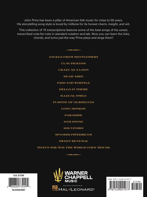 John Prine has been a pillar of American folk music for close to 50 years. His storytelling song style is loved by millions for its honest charm, insight and wit. This collection of 15 transcriptions features some of the best songs of his career, transcribed note-for-note in standard notation and tab. Now you can learn the licks, chords and lyrics just the way Prine plays and sings them! Songs include: Angels from Montgomery · Illegal Smile · In Spite of Ourselves · Paradise · Sam Stone · Souvenirs · and more.