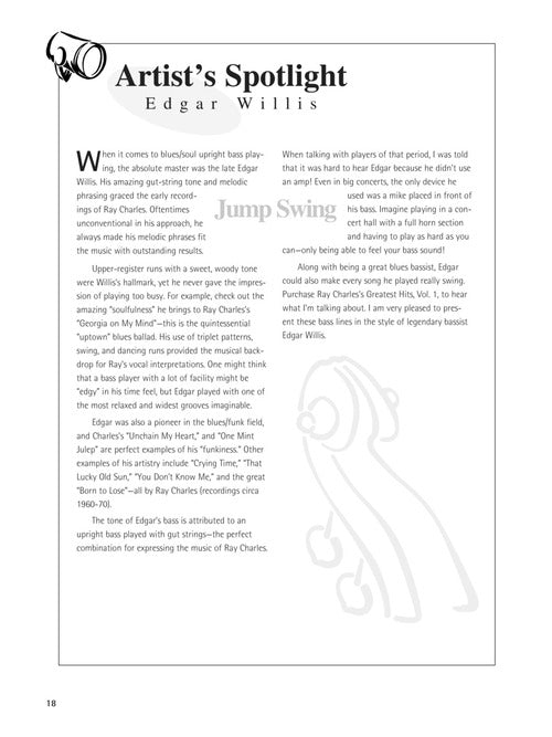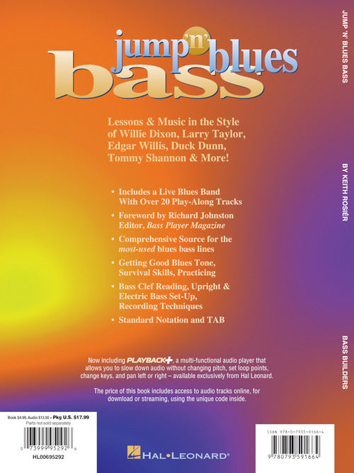 Essential jump/swing and modern blues bass lines for electric and upright players. Includes lessons and music in the style of Willie Dixon, Larry Taylor, Edgar Willis, Duck Dunn, Tommy Shannon, and more! The audio includes a live blues band with over 20 play-along tracks. The audio is accessed online using the unique code inside the book and can be streamed or downloaded. The audio files include PLAYBACK+, a multi-functional audio player that allows you to slow down audio without changing pitch, set loop points, change keys, and pan left or right.