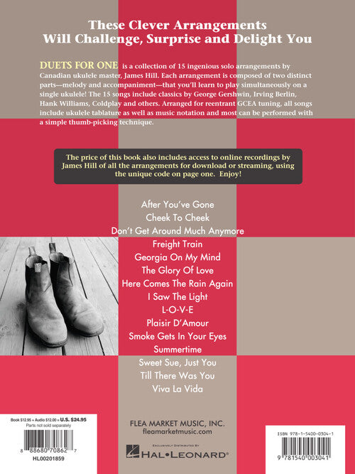 This collection features 15 classic songs arranged by ukulele master, James Hill. In these remarkable arrangements, two distinct ukulele parts - chord accompaniment and melody - can be played in counterpoint at the same time by one player. The arrangements cater to both advanced beginner and experienced players and there is a warm-up section that introduces the player to the Duets for One concept. The book includes access to audio tracks online of all the arrangements performed by James Hill, for download or streaming, using the unique code inside the book. Songs are arranged for GCEA-tuned ukes and include: Georgia On My Mind · Summertime · Don't Get Around Much Anymore · The Glory of Love · Here Comes the Rain Again · L-O-V-E · Cheek to Cheek · Viva La Vida · and 7 more.
