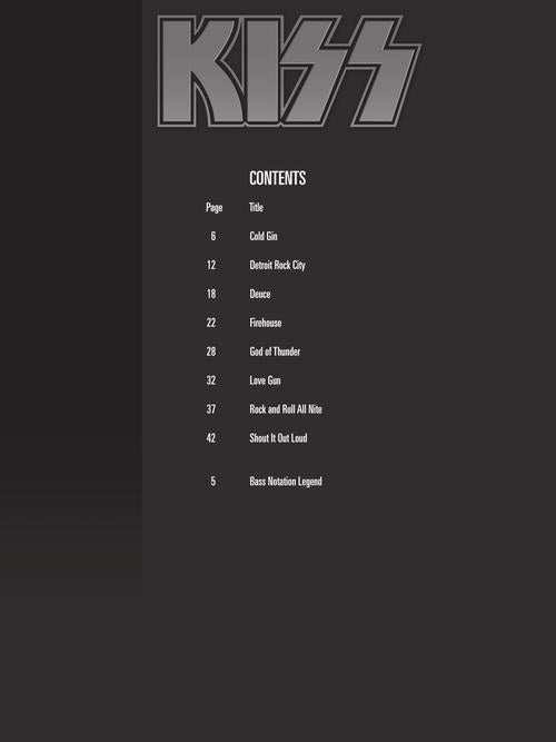The Bass Play-Along Series will help you play your favorite songs quickly and easily! Just follow the tab, listen to the audio to hear how the bass should sound, and then play along using the separate backing tracks. The melody and lyrics are also included in the book in case you want to sing, or to simply help you follow along. Songs: Cold Gin · Detroit Rock City · Deuce · Firehouse · God of Thunder · Love Gun · Rock and Roll All Nite · Shout It Out Loud. Audio is accessed online using the unique code inside the book and can be streamed or downloaded. The audio files include PLAYBACK+, a multi-functional audio player that allows you to slow down audio without changing pitch, set loop points, change keys, and pan left or right.