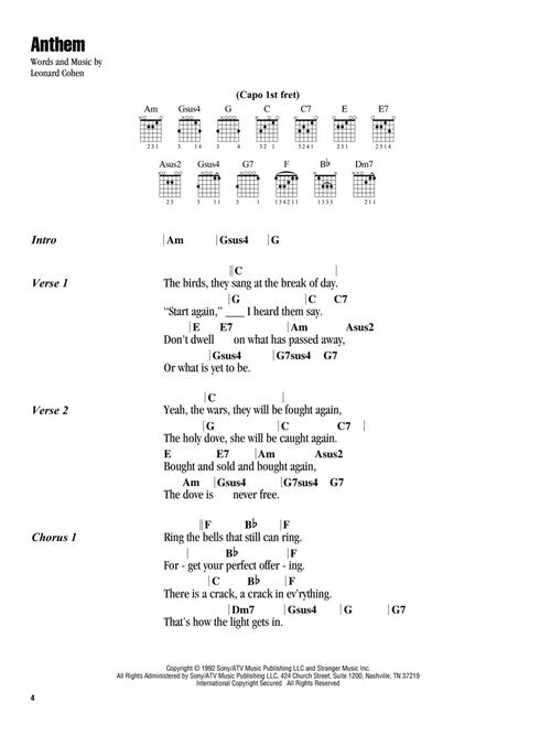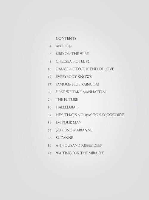 Lyrics, chord symbols and guitar chord diagrams for 15 classic songs by Cohen, including the ever-popular Hallelujah as well as: Anthem · Bird on the Wire (Bird on a Wire) · Chelsea Hotel #2 · Dance Me to the End of Love · Everybody Knows · Famous Blue Raincoat · First We Take Manhattan · The Future · Hey, That's No Way to Say Goodbye · I'm Your Man · So Long Marianne · Suzanne · A Thousand Kisses Deep · Waiting for the Miracle.