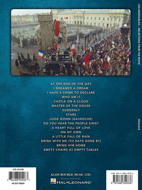16 selections from this beautiful musical arranged especially for the ukulele with lyrics: At the End of the Day · Bring Him Home · Castle on a Cloud · Do You Hear the People Sing? · Drink with Me (To Days Gone By) · A Heart Full of Love · I Dreamed a Dream · A Little Fall of Rain · Master of the House · On My Own · Stars · Suddenly · Who Am I? · and more.