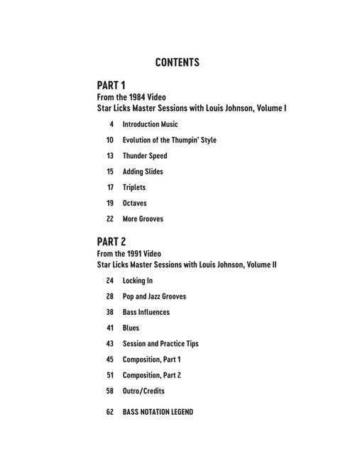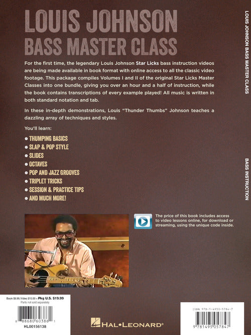For the first time, the legendary Louis Johnson Star Licks bass instruction videos are being made available in book format with online access to all the classic video footage. This package compiles Volumes I and II of the original Star Licks Master Classes into one bundle, giving you over an hour and a half of instruction, while the book contains transcriptions of every example played! All music is written in both standard notation and tab. In these in-depth demonstrations, Louis Thunder Thumbs Johnson teaches a dazzling array of techniques and styles. You'll learn: thumping basics · slap & pop style · slides · octaves · pop and jazz grooves · triplet tricks · session & practice tips · and much more.