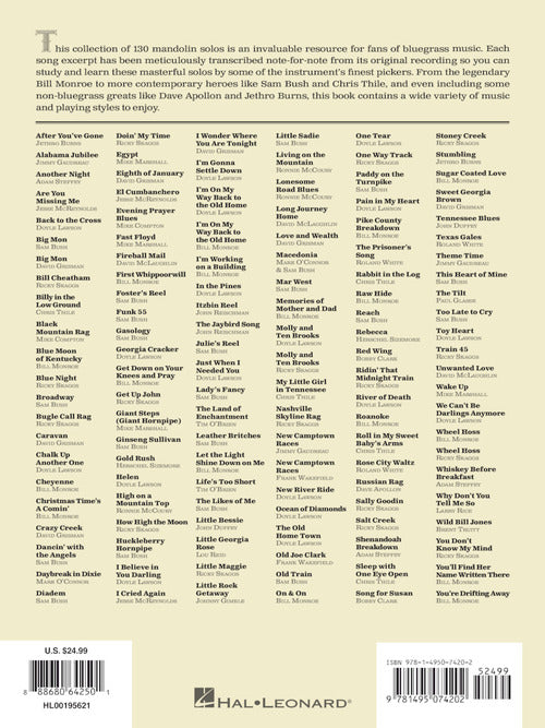 This collection of 130 mandolin solos is an invaluable resource for fans of bluegrass music. Each song excerpt has been meticulously transcribed note-for-note in tab from its original recording so you can study and learn these masterful solos by some of the instrument's finest pickers. From the legendary Bill Monroe to more contemporary heroes like Sam Bush and Chris Thile, and even including some non-bluegrass greats like Dave Apollon and Jethro Burns, this book contains a wide variety of music and playing styles to enjoy.
