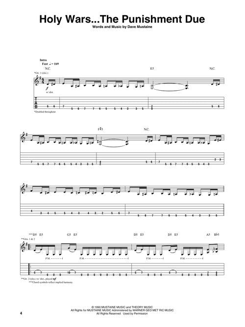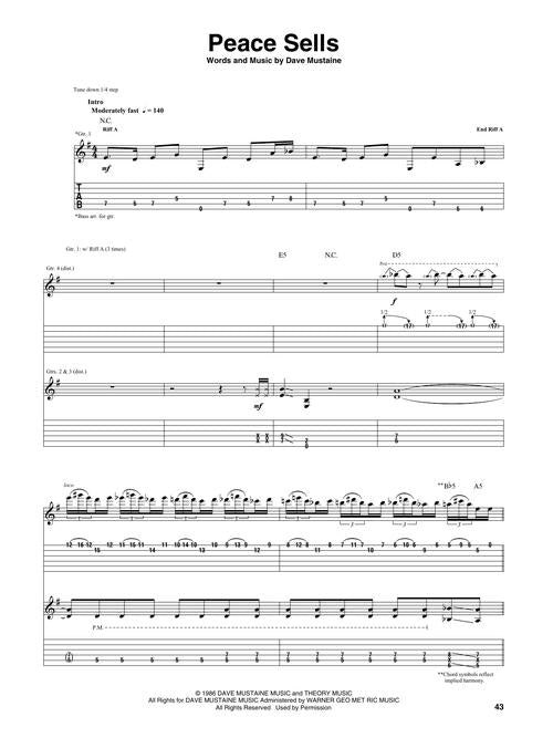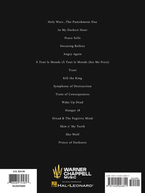 16 songs from the greatest hits release by this popular heavy metal band which were recorded between 1984 & 2000, presented in authentic guitar transcriptions with notes and tablature. Includes: Angry Again · Dread & the Fugitive Mind · Hangar 18 · Holy Wars...The Punishment Due · In My Darkest Hour · Kill the King · Peace Sells · Prince of Darkness · She-Wolf · Skin O' My Teeth · Sweating Bullets · Symphony of Destruction · A Tout Le Monde (A Tout Le Monde (Set Me Free) · Train of Consequences · Trust · Wake up Dead.