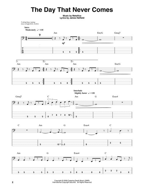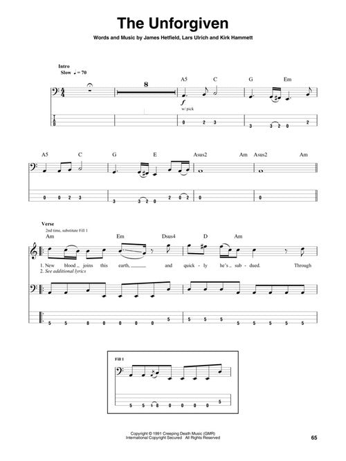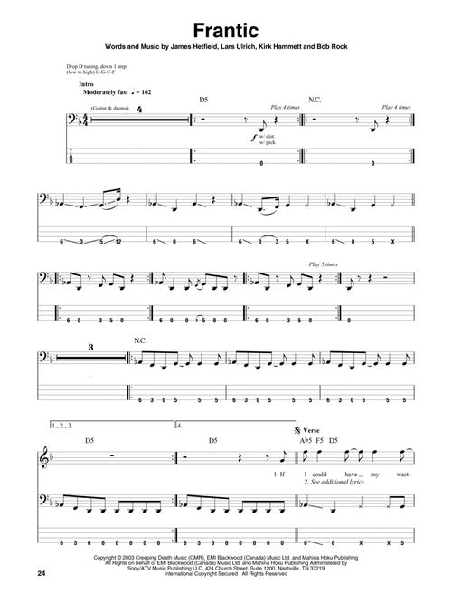 The Bass Play-Along Series will help you play your favorite songs quickly and easily! Just follow the tab, listen to the audio to hear how the bass should sound, and then play along using the separate backing tracks. The melody and lyrics are also included in the book in case you want to sing, or to simply help you follow along. The audio is available online for download or streaming, and it is enhanced so you can adjust the recording to any tempo without changing pitch! 8 songs: The Day That Never Comes · Enter Sandman · Frantic · Fuel · King Nothing · Moth into Flame · Nothing Else Matters · The Unforgiven.