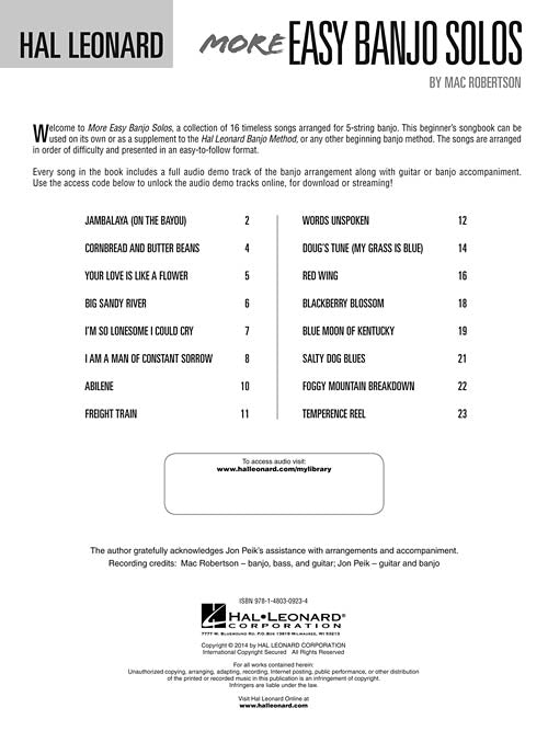 More Easy Banjo Solos - 2nd Edition for 5-String Banjo Softcover Audio Online Play 5-string banjo arrangements of your favorite songs from Flatt & Scruggs, Hank Williams, Steve Martin, Bill Monroe, Carolina Chocolate Drops and more! This collection of 16 songs is presented in order of difficulty, beginning with roll variations and ending with melodic style. Songs include: Abilene · Big Sandy River · Cornbread and Butter Beans · Foggy Mountain Breakdown · I Am a Man of Contant Sorrow · Jambalaya (On the Bayou) · Words Unspoken · and more. The price of this book includes online access to audio demo tracks of every song, for download or streaming, using the unique code inside the book. Online audio is accessed at halleonard.com/mylibrary (http://www.halleonard.com/mylibrary) Inventory # : 00114599 UPC: 888680019686 ISBN: 1480309230 Width: 9" Length: 12" Height: 0.08" Product Weight: 0.3 lbs. Number of Pages: 24
