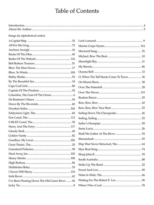 Climb aboard for an exciting musical cruise - unlatch your sea chest, break out the ukulele, and cast off with 62 songs of oceans, rivers, canals, lakes and bays. Songs include: Anchors Aweigh · Blow the Man Down · Cape Cod Girls · The Erie Canal · Goodbye, My Lover · Haul Away, Joe · Irish Rover · My Bonnie · Over the Waves · Sailor's Hornpipe ·¦Sloop John B. · Mermaid Song · Michael, Row the Boat Ashore · Sailing, Sailing · and many more.