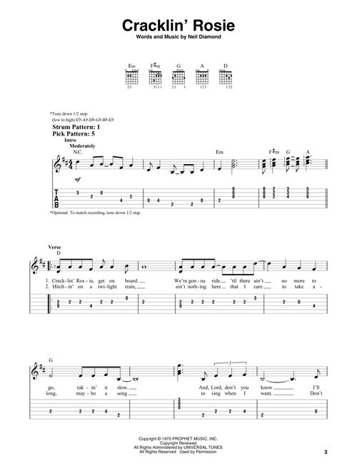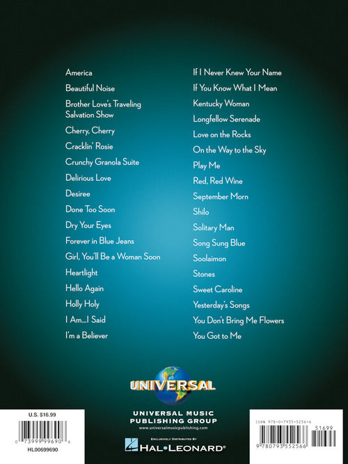 35 of Diamond's most memorable songs are included in this second edition featuring easy guitar arrangements with notes and tab. Songs include: America · Cracklin' Rosie · Heartlight · Hello Again · I Am...I Said · I'm a Believer · September Morn · Song Sung Blue · Sweet Caroline · You Don't Bring Me Flowers · and more.