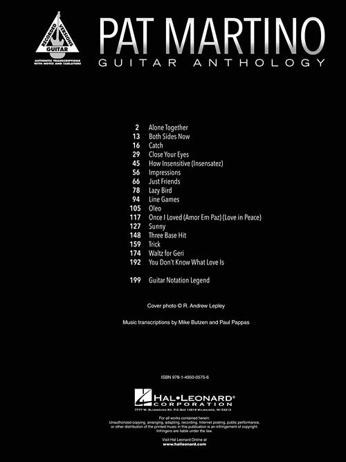 This collection of 16 songs from world-renowned jazz guitarist Pat Martino features specially selected highlights from his career, transcribed note-for-note in standard notation and tab. With this book, guitarists can explore the lyrical, melodic style and rapid-fire lines that have made Martino famous, and play the exact melodies and solos hear on his classic recordings. Includes: Alone Together · Both Sides Now · Close Your Eyes · How Insensitive (Insensatez) · Impressions · Just Friends · Lazy Bird · Oleo · You Don't Know What Love Is · and more.