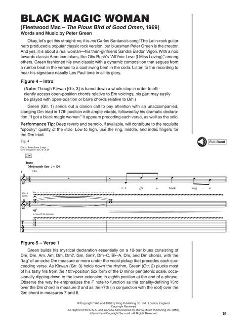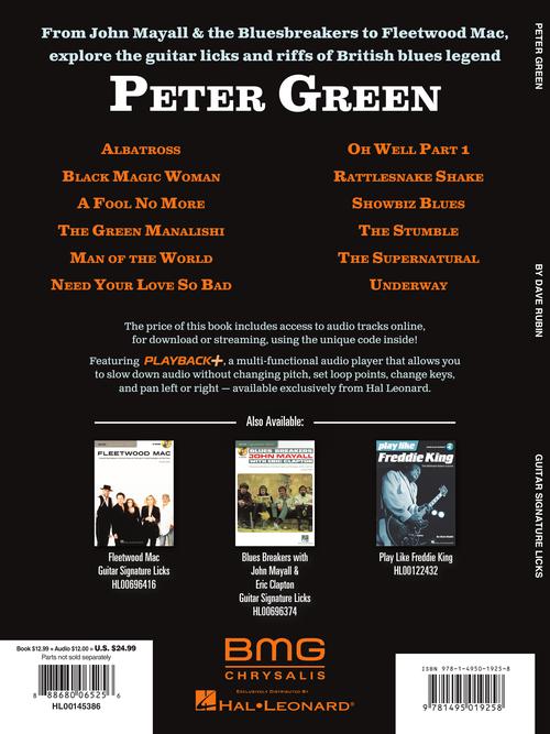 Explore the guitar licks, riffs, and techniques of British blues legend Peter Green with this hands-on analysis by Dave Rubin. Songs include: Albatross · Black Magic Woman · A Fool No More · Man of the World · Need Your Love So Bad · Rattlesnake Shake · Showbiz Blues · The Stumble · Underway · and more. This book includes access to online audio tracks for download or streaming, now including PLAYBACK+. This multi-functional audio player allows you to slow down audio without changing pitch, set loop points, change keys, pan left or right, and more.