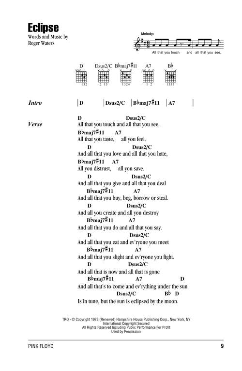 Features 30 songs with complete lyrics, chord symbols, and guitar chord diagrams from the incomparable British band, including: Another Brick in the Wall, Part 2 · Brain Damage · Breathe · Comfortably Numb · The Great Gig in the Sky · Hey You · Money · Mother · Run like Hell · Us and Them · Wish You Were Here · Young Lust · and many more.