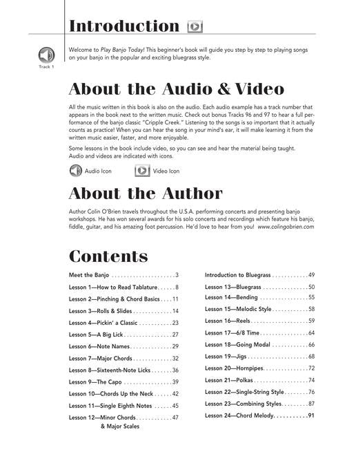 This convenient compilation includes Book 1 and Book 2 with the corresponding audio and video lessons. This banjo method can be used by students who want to teach themselves, or by teachers for private or group instruction. Simply follow the tips and lessons in the book as you listen to the teacher and watch the video. Learn at your own pace with over 140 great songs and examples! Topics covered include: songs, chords and melodies · picking and strumming · playing tips and techniques · music notation · and more.