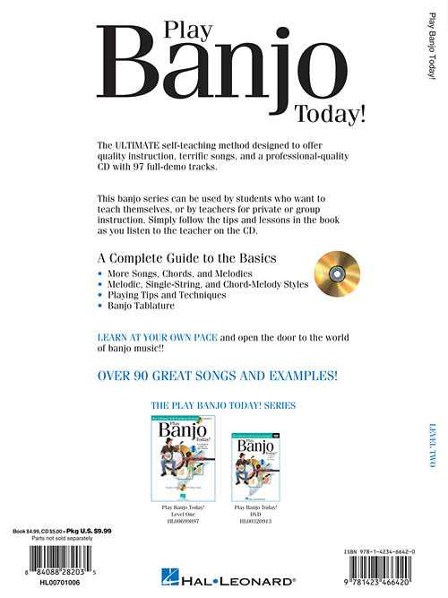 Play Today! is the ultimate self-teaching series, designed to offer quality instruction, terrific songs, and professional-quality demo tracks. This banjo method can be used by students who want to teach themselves, or by teachers for private or group instruction. Simply follow the tips and lessons in the book as you listen to the teacher on the CD. Book 2 features: more songs, chords, and melodies; melodic, single-string, and chord-melody styles; playing tips and techniques; banjo tablature; and more, with a 97-track CD. Learn at your own pace and open the door to the world of banjo music!
