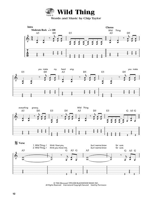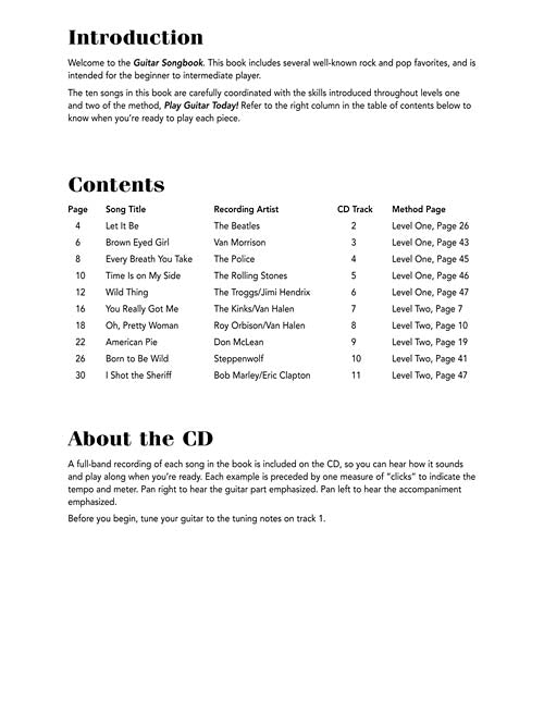 This companion songbook to the Play Guitar Today! method books features 10 great songs: American Pie (Don McLean) · Born to Be Wild (Steppenwolf) · Brown Eyed Girl (Van Morrison) · Every Breath You Take (The Police) · I Shot the Sheriff (Bob Marley/Eric Clapton) · Let It Be (The Beatles) · Oh, Pretty Woman (Roy Orbison/Van Halen) · Time Is on My Side (Rolling Stones) · Wild Thing (The Troggs) · You Really Got Me (The Kinks). Includes tab and demonstration tracks. The audio is accessed online using the unique code inside the book and can be streamed or downloaded. The audio files include PLAYBACK+, a multi-functional audio player that allows you to slow down audio without changing pitch, set loop points, change keys, and pan left or right.