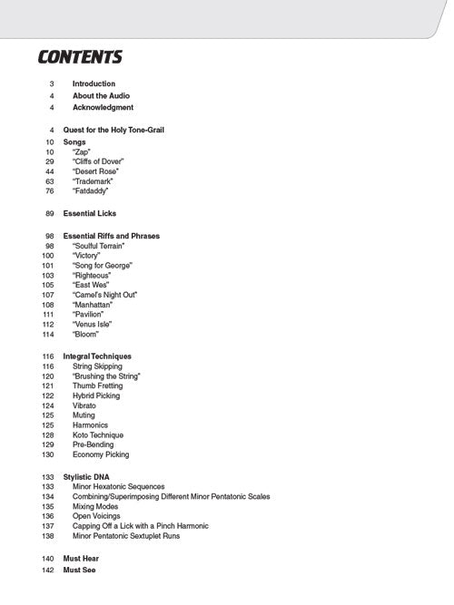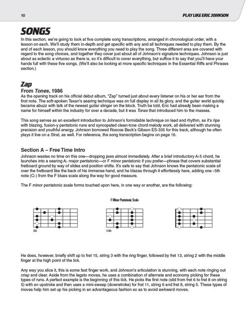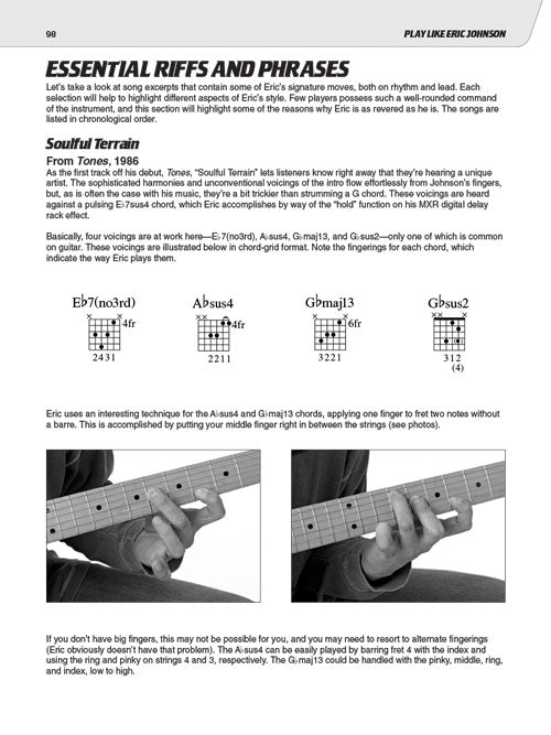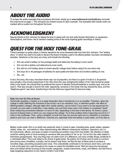 Study the trademark songs, licks, tones, and techniques of the guitar wonder Eric Johnson. This comprehensive book and audio teaching method provides detailed analysis of Johnson's gear, tone, techniques, styles, songs, licks, riffs, and much more. Includes a unique code that will give you access to audio files of all the music in the book online. Full songs include: Cliffs of Dover · Desert Rose · Fatdaddy · Trademark · Zap · plus excerpts from ten more Johnson tunes.