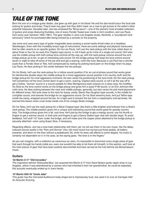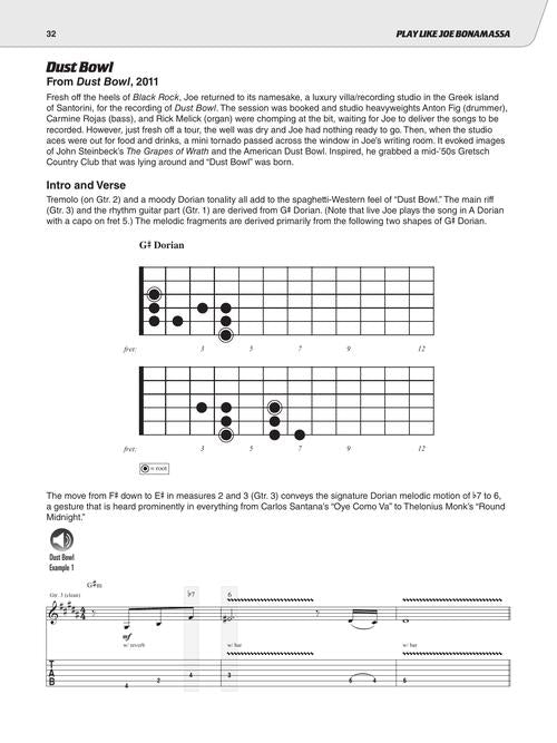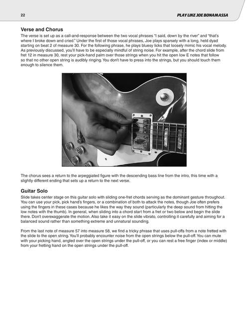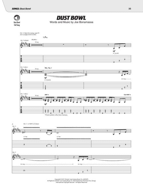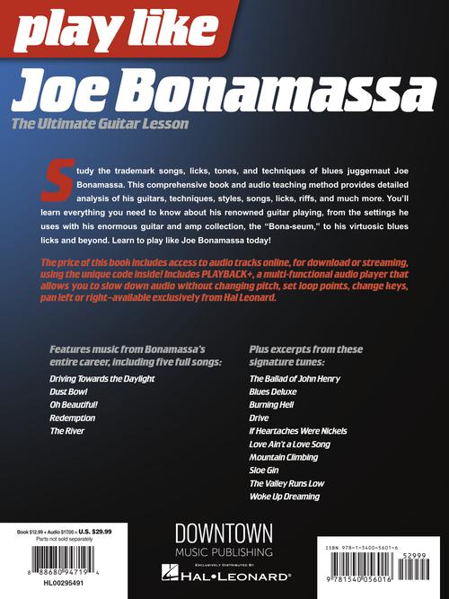 Study the trademark songs, licks, tones, and techniques of blues juggernaut Joe Bonamassa. This comprehensive book and audio teaching method provides detailed analysis of his guitars, techniques, styles, songs, licks, riffs, and much more. You'll learn everything you need to know about his renowned guitar playing, from the settings he uses with his enormous guitar and amp collection, the Bona-seum, to his virtuosic blues licks and beyond. Learn to play like Joe Bonamassa today! Includes five full songs: Driving Towards the Daylight · Dust Bowl · Oh Beautiful! · Redemption · The River · and excerpts from ten other signature tunes. Audio is accessed online using the unique code inside the book and can be streamed or downloaded. The audio files include PLAYBACK+, a multi-functional audio player that allows you to slow down audio without changing pitch, set loop points, change keys, and pan left or right.