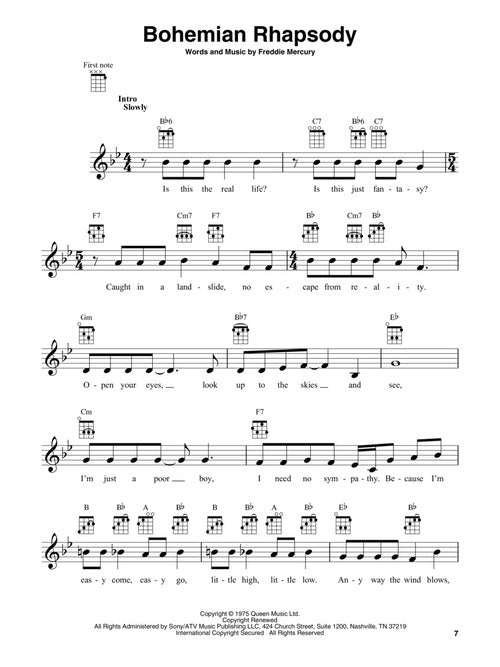 14 hits from Freddie Mercury and crew for uke, in standard G-C-E-A tuning with melody, lyrics and chord diagrams. Includes: Another One Bites the Dust · Bohemian Rhapsody · Crazy Little Thing Called Love · Don't Stop Me Now · I Want It All · I Want to Break Free · Killer Queen · Radio Ga Ga · Save Me · The Show Must Go On · Under Pressure · We Are the Champions · We Will Rock You · You're My Best Friend.