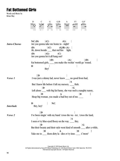 Just the chords and lyrics for 20 of the biggest hits from this revolutionary British rock band, including: Another One Bites the Dust · Bohemian Rhapsody · Crazy Little Thing Called Love · Don't Stop Me Now · Fat Bottomed Girls · Killer Queen · Somebody to Love · Under Pressure · We Are the Champions · We Will Rock You · You're My Best Friend · and more.