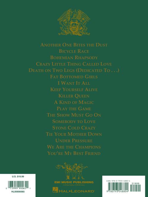 Features bass transcriptions of 18 Queen classics: Another One Bites the Dust · Bicycle Race · Bohemian Rhapsody · Crazy Little Thing Called Love · Fat Bottomed Girls · The Show Must Go On · Stone Cold Crazy · Tie Your Mother Down · Under Pressure · We Are the Champions · more.