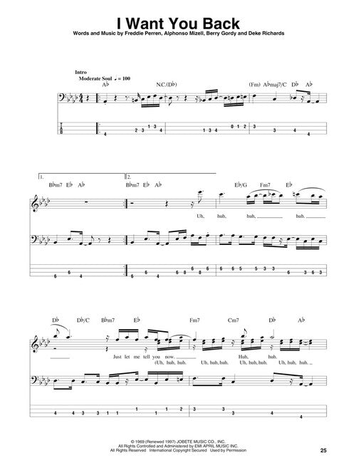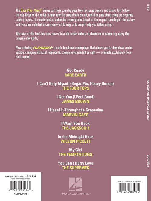 The Bass Play-Along Series will help you play your favorite songs quickly and easily! Just follow the tab, listen to the audio tracks to hear how the bass should sound, and then play along using the separate backing tracks. The melody and lyrics are also included in the book in case you want to sing, or to simply help you follow along. Songs: Get Ready · I Can't Help Myself (Sugar Pie, Honey Bunch) · I Got You (I Feel Good) · I Heard It Through the Grapevine · I Want You Back · In the Midnight Hour · My Girl · You Can't Hurry Love. Audio is accessed online using the unique code inside the book and can be streamed or downloaded. The audio files include PLAYBACK+, a multi-functional audio player that allows you to slow down audio without changing pitch, set loop points, change keys, and pan left or right.