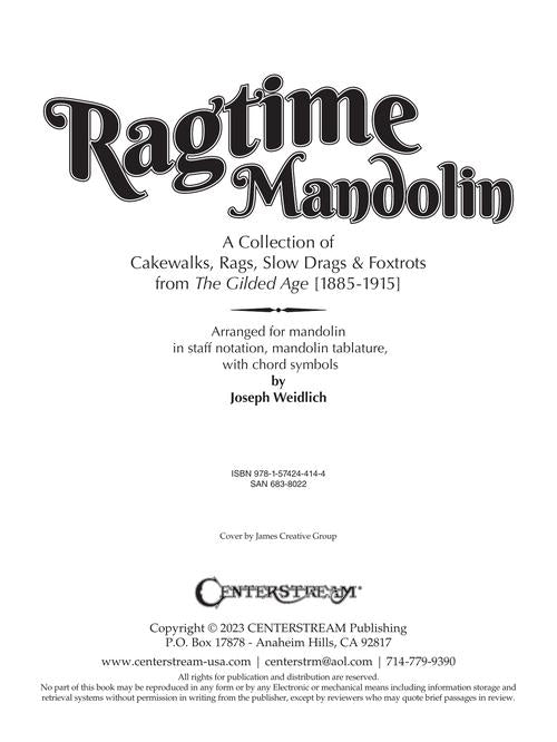 The popularity of the mandolin in the United States between 1885-1915 led to the formation of many regional mandolin orchestras and mandolin clubs across the country, particularly in the urban areas of the Northeast and Midwest, but also as far west as San Francisco and as far south as New Orleans, e.g., the Tulane University Mandolin Club. In fact, Scott Joplin dedicated one of his early rags, The Entertainer, to his local mandolin club in Sedalia, Missouri, i.e., to Mr. James Brown and his mandolin club. So tune up your mandolin and enjoy playing the music that would have been heard in the neighborhood dance halls and feel like you're back in the Gilded Age! Each song in this collection is arranged for mandolin in staff notation and mandolin tablature with chord symbols.
