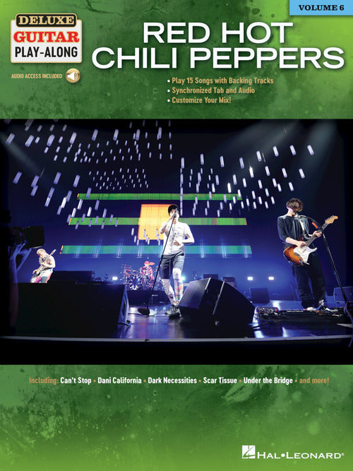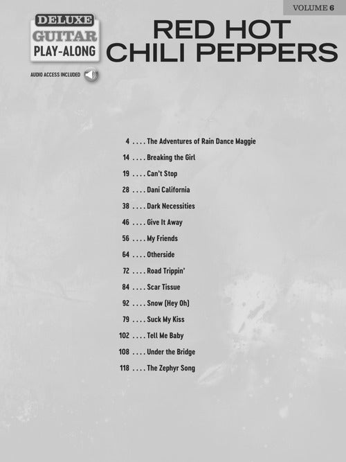 The Deluxe Guitar Play-Along series will help you play songs faster than ever before! Accurate, easy-to-read guitar tab and professional, customizable audio for 15 songs. The interactive, online audio interface includes tempo/pitch control, looping, buttons to turn instruments on or off, and guitar tab with follow-along marker. The price of this book includes access to audio tracks online using the unique code inside. The tracks can also be downloaded and played offline. Now including PLAYBACK+, a multi-functional audio player that allows you to slow down audio, change pitch, set loop points, and pan left or right - available exclusively from Hal Leonard. This volume includes 15 songs: The Adventures of Rain Dance Maggie · Breaking the Girl · Can't Stop · Dani California · Dark Necessities · Give It Away · My Friends · Otherside · Road Trippin' · Scar Tissue · Snow (Hey Oh) · Suck My Kiss · Tell Me Baby · Under the Bridge · The Zephyr Song.