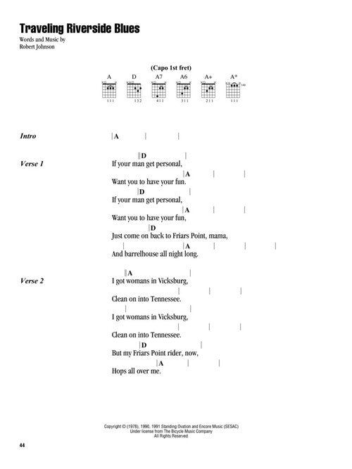 Lyrics, chord symbols and guitar chord frames for 20 classic songs by this legendary blues guitarist are presented in this collection, including: Come on in My Kitchen · Cross Road Blues (Crossroads) · I Believe I'll Dust My Broom · Kind Hearted Woman Blues · Last Fair Deal Gone Down · Me and the Devil Blues · Ramblin' on My Mind · Sweet Home Chicago · Traveling Riverside Blues · and more.