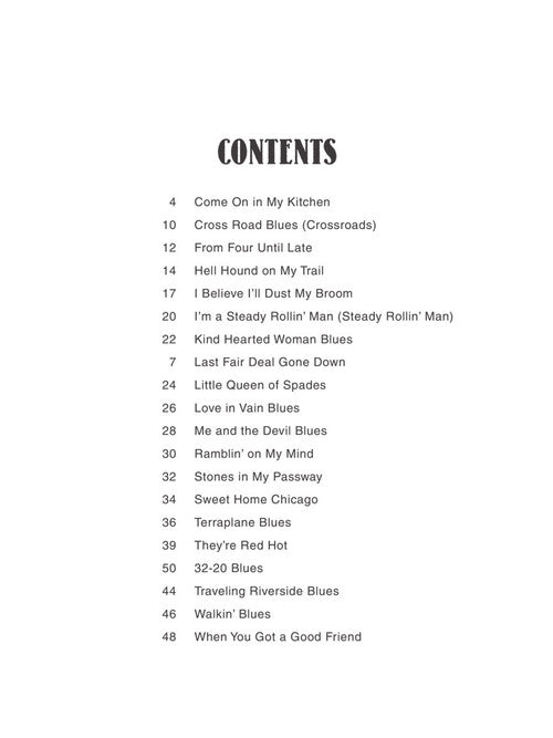 Lyrics, chord symbols and guitar chord frames for 20 classic songs by this legendary blues guitarist are presented in this collection, including: Come on in My Kitchen · Cross Road Blues (Crossroads) · I Believe I'll Dust My Broom · Kind Hearted Woman Blues · Last Fair Deal Gone Down · Me and the Devil Blues · Ramblin' on My Mind · Sweet Home Chicago · Traveling Riverside Blues · and more.